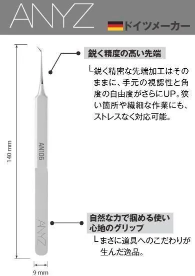 大人気を誇るストレートタイプに続き、ついに新ラインナップが登場!【ANYZ MODELS】が、モデラーの声に応え、試作を重ねて生み出した“つる首タイプ”の超精密モデリングピンセット。