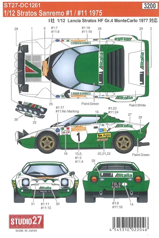 Studio 27 1/12 Lancia Stratos “Alitalia” Sanremo No.11 1975 Full Decal Italeri Compatible DC1261