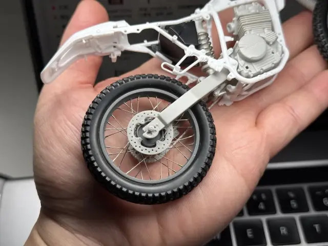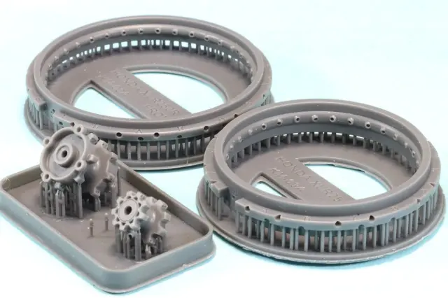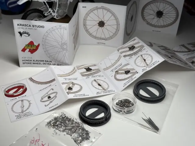 ディティルアップパーツのホイールとしては究極の完成度のものになると思います。スポークは1本1本金属線を組み込んでいきますが、スポークを組み込む穴のサイズが絶妙に調整されているので差し込みはスムーズで尚且つテンションがかかるため抜け落ちていく心配もありません。スポークをすべて組み終わってから軽く接着剤で固定してあげることでしっかりと強度のとれるホイールが完成します。箱車でも一際目立つ足元のドレスアップにぜひご利用ください。