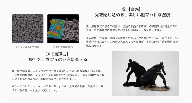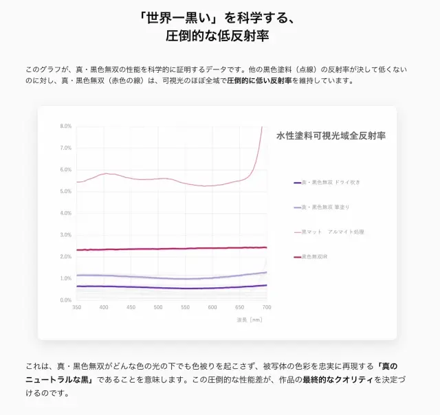 世界一黒い水性アクリル塗料「真・黒色無双」。ベルベットにも匹敵する圧倒的な光吸収性能を、塗装環境を選ばない水性塗料で実現した製品です。 可視光域の光吸収率について、一般的な黒色塗料が94~98%となるのに対し、真・黒色無双(エアブラシドライ塗装)は99.4%(全反射率0.6%)を達成しております。絵画や立体造形への塗料として使用することで、見たことのない表現方法を作り出すことができます。