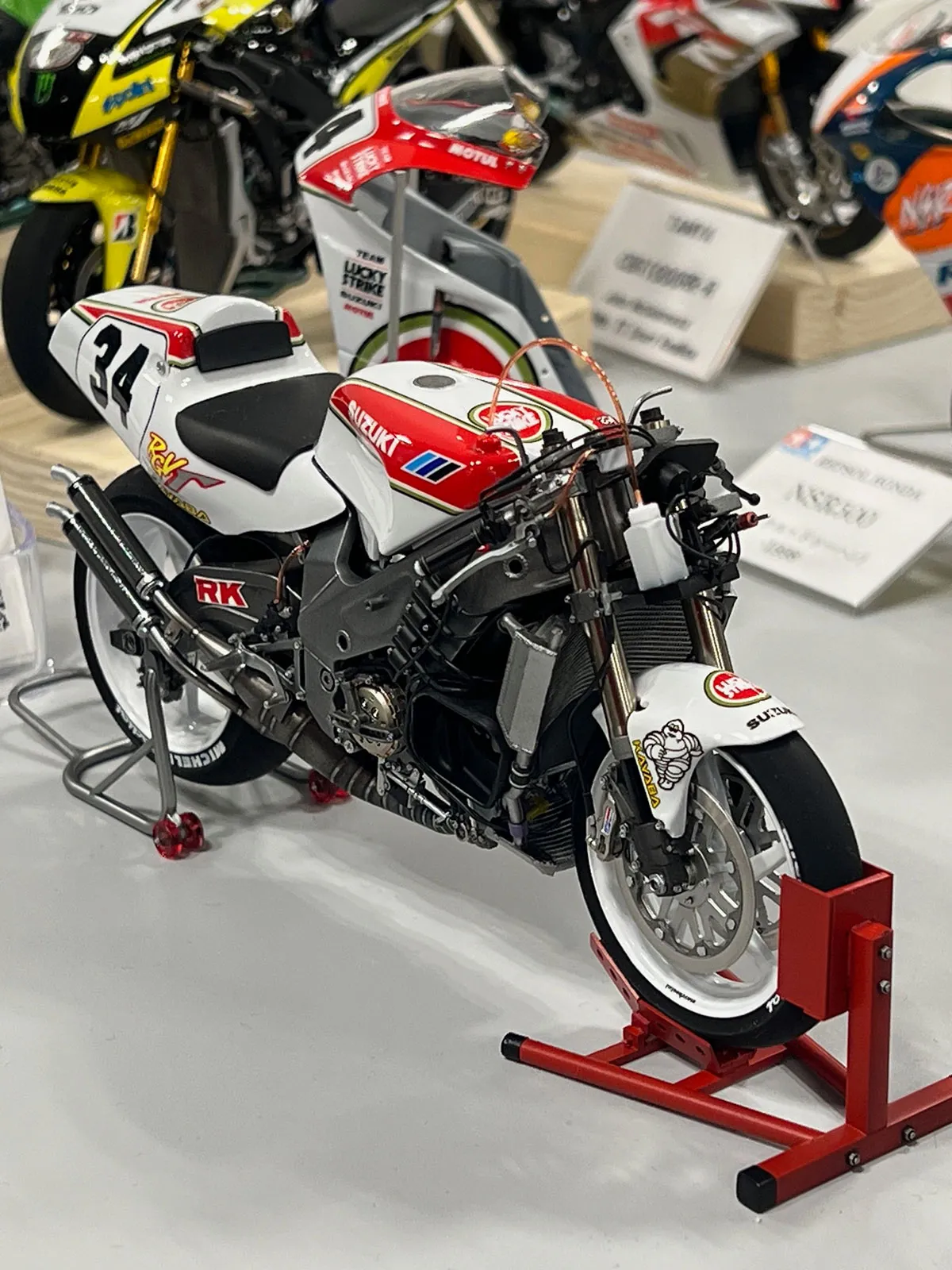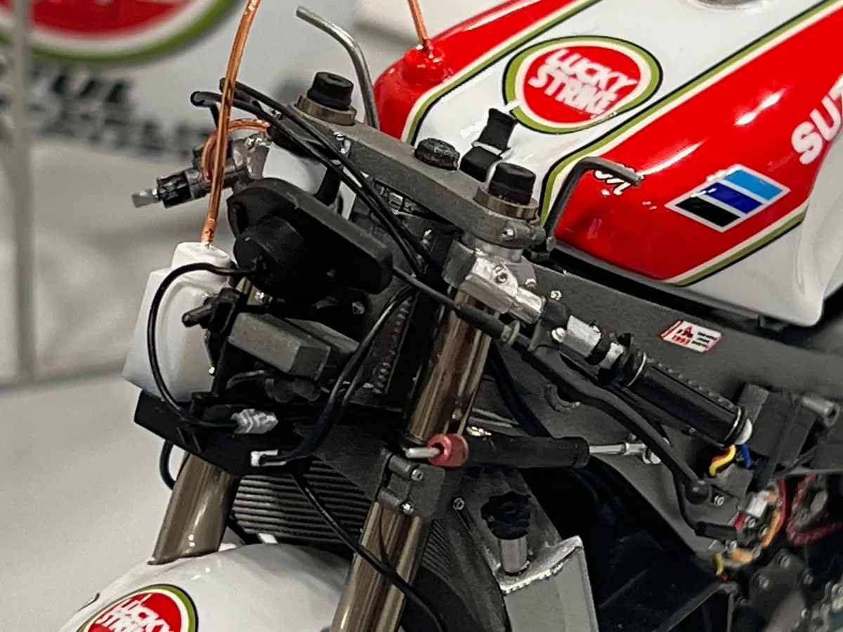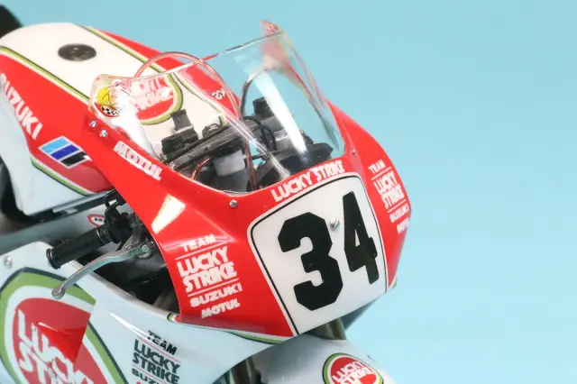 プラッツのプラモデルベース完成品です。ディティールアップ可能の箇所はとことんディティールアップを施して仕上げています。詳細は後述しますが、まず目を見張るのはカウルメインロゴのラッキーストライクです。いくつも完成品を見てきましたがフロントカウルとアンダーカウル境界線でどうしてもズレが起きてしまうのでがこのモデルは見事その難所を克服し綺麗に仕上げられています。