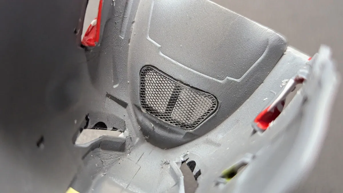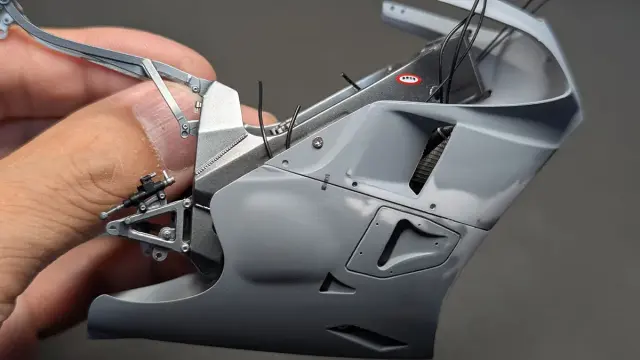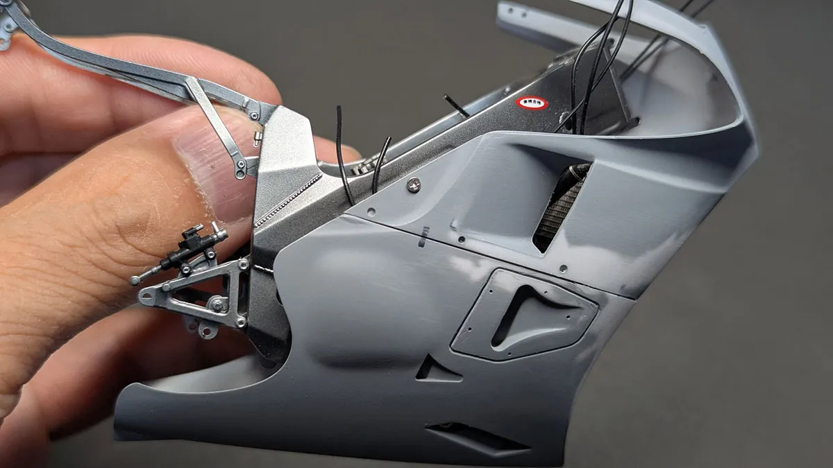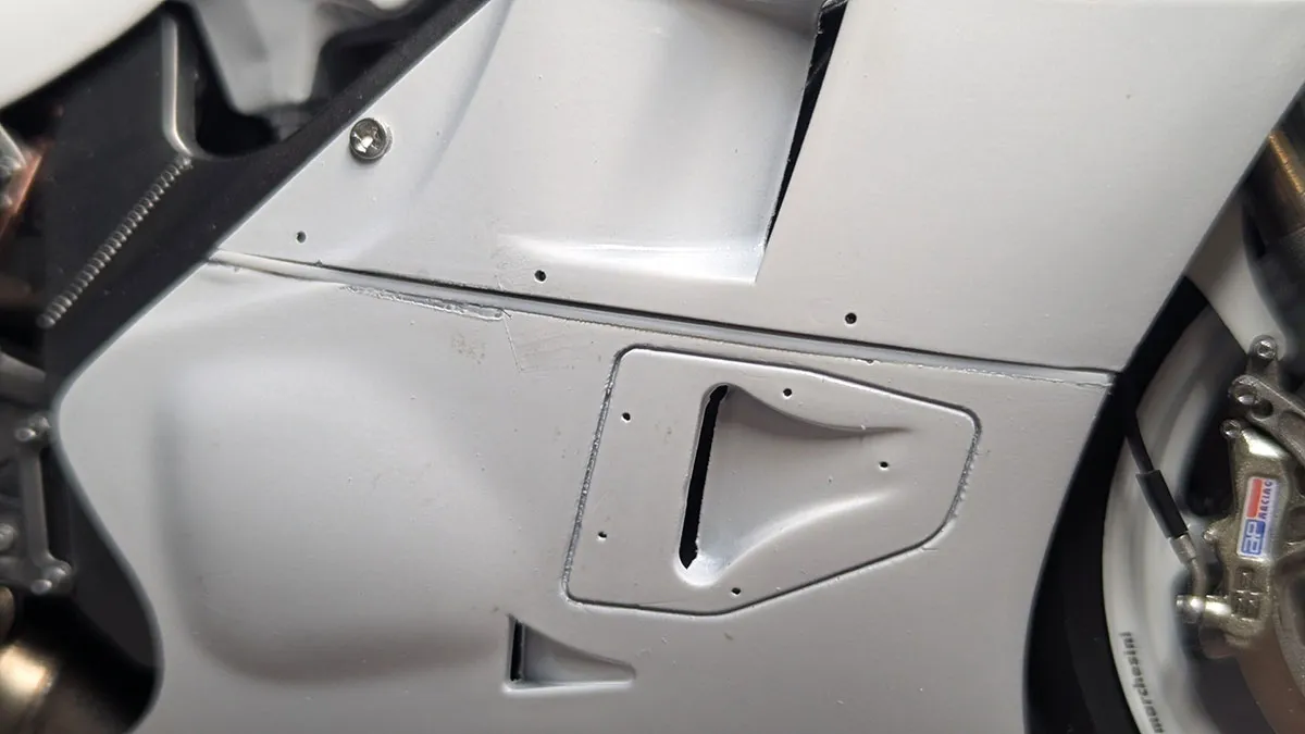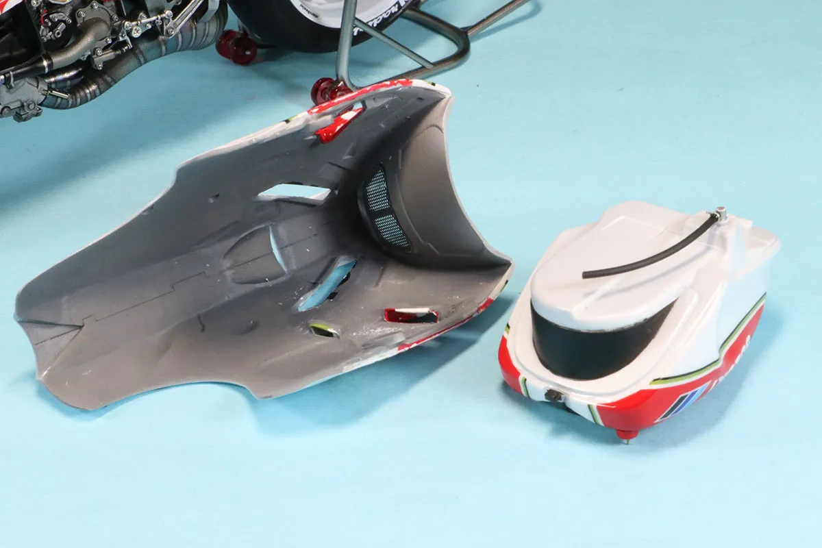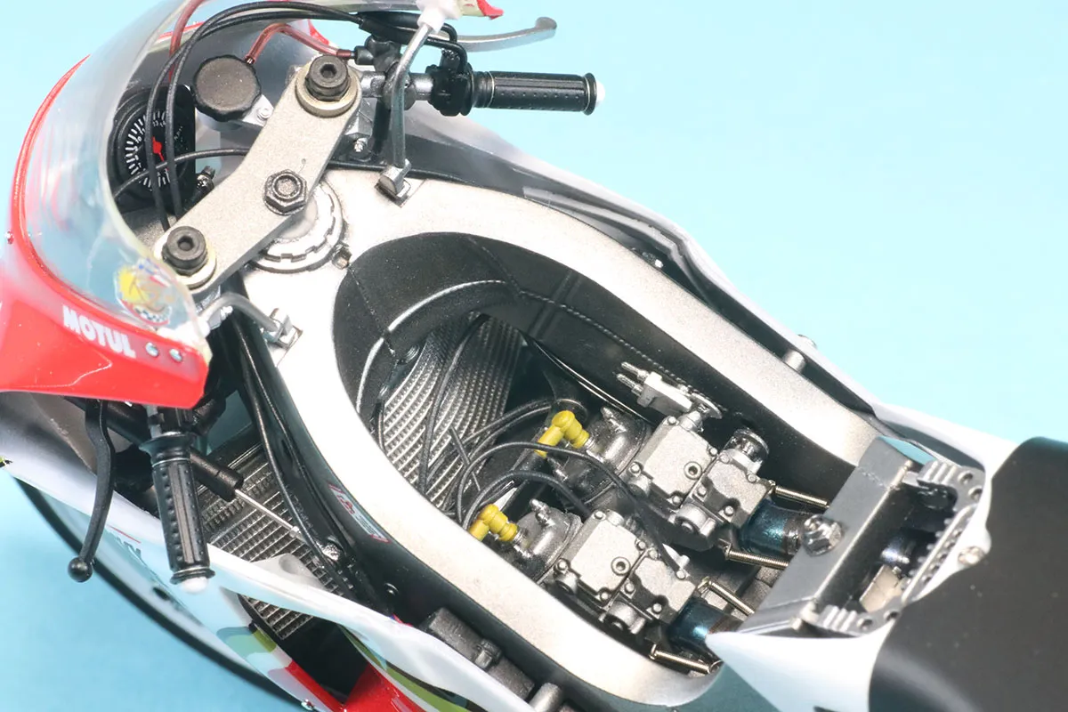 アンダーカウルをマグネット固定にしているため、どこにも干渉せず無理な力がかからない位置にするとなると、カウル接合部に1mmくらいのズレや隙間が出来てしまいます。それで、削って辻褄を合わせたり、プラ板で隙間を埋めたりしました。車体が出来上がってからの仮組みをする必要があり、アッパーカウルを2回ほど脱着しましたが、ラジエターの接着が取れたりして大変でした。」とのことです。