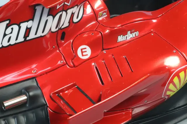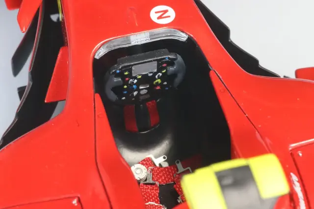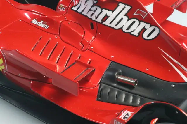 フジミのプラモデルベースです。製作はロム専属モデラーである竹田文義氏です。ボディカラーはキャンディレッド仕上げですが、これまで発売されてきたBBRやマテルなどのキャンディレッドではなくとても落ち着いた深みのあるキャンディレッドになっています。フィニッシャーズから発売されているマイカレッド(フィニッシャーズカラーのマイカレッドを使用した完成品はコチラ https://romu-romu.com/SHOP/RFTMK374_YS.html)とギラギラしたキャンディレッドの中間のような仕上がりです。個人の感想としてはこれまで見たことのないF2007のカラーですがすごく納得できるカラーになっていると思います。