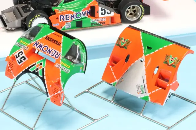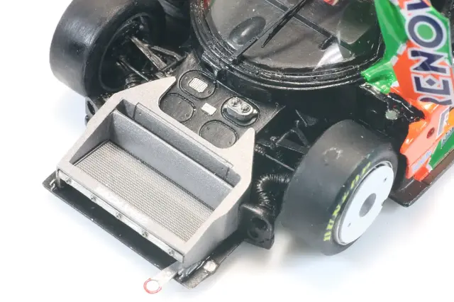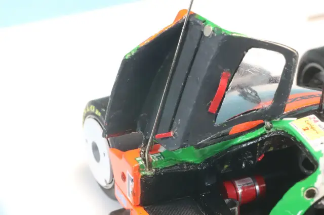 あと細かい箇所になりますが、前後カウルは取り付け後しっかり固定できるようピンがうめこまれています。またドアは塗装の厚みでどうしても自立オープンする位置まで開き切ることができませんのでオープン状態にするためのステーの差し込みギミックも仕組まれています。