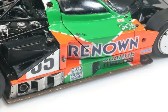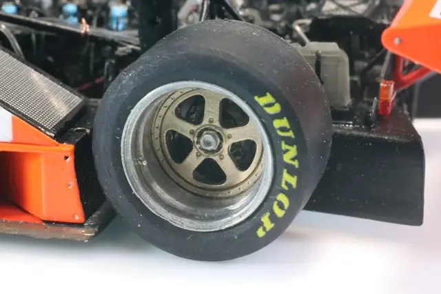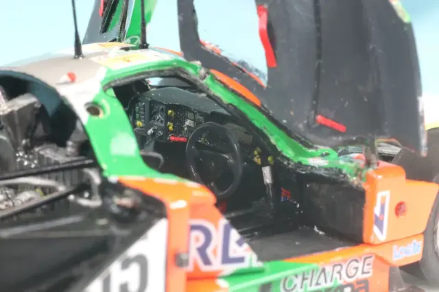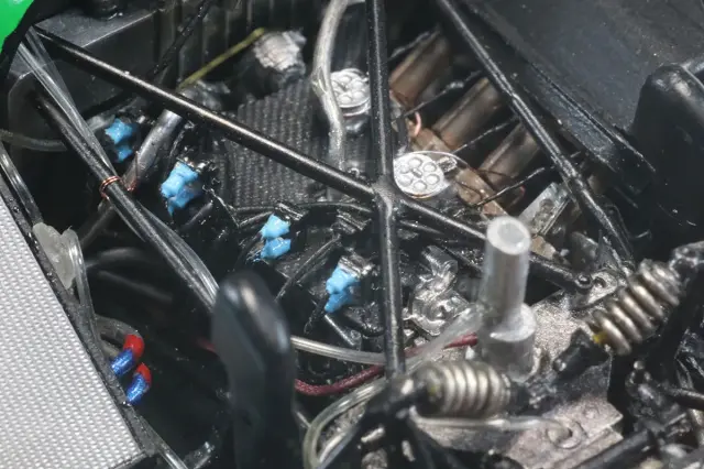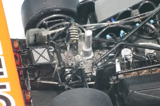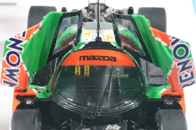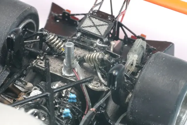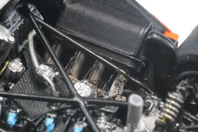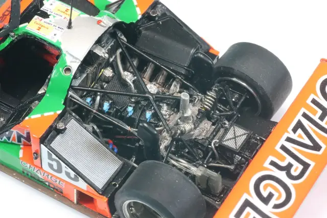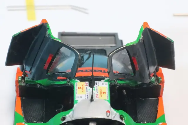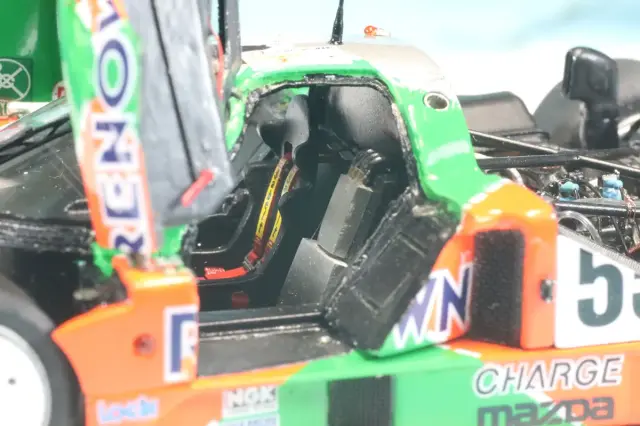 まずこのキットは前後ともにアンダートレイとカウルの位置設計がずれています。とくにリヤタイヤはキットのまま取り付けるとホイールハウスのセンターから前方に1mm程度ずれていますのでエンジン部分から全体を後ろに1mmずらして取り付けています。まだドアのヒンジもそのままでは開閉しません。仮組の段階でこのヒンジを差し替えてスムーズに開閉できるようにしておかないといけません。つまり、仮組の段階で一度奇麗に完成させる必要があります。今回内部ディティールアップはさほど手を入れていませんがそれでもカウルが干渉するためその部分も合わせて修正してしまいます。そのご全てをばらして塗装へ入ります。