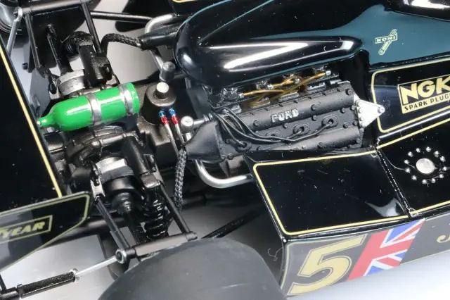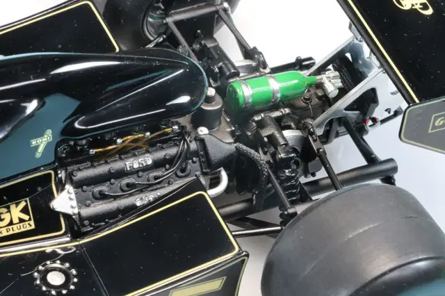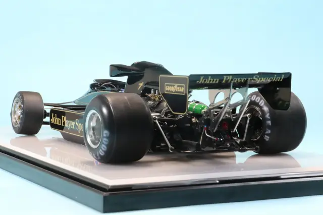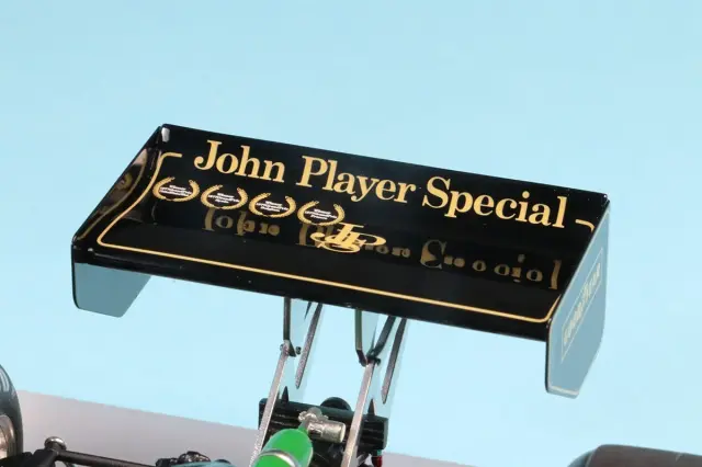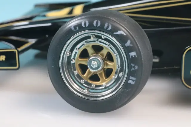 実車検証も抜かりなく、6本スポークホイール、フロント翼端板は楔形、フロントカーナンバーはサイドと同じフォントのもを使用して仕上げています。ロータス78の販売価格は90年前後のF1マシンよりも高額に設定しておりますが、部品数が多く、特に仕上げに時間のかかるカウルパーツが多いので、工数が通常の1.5〜2倍かかっているためです。