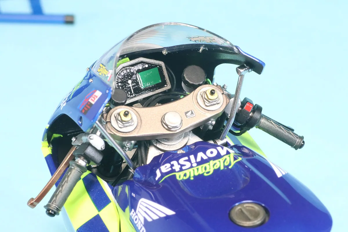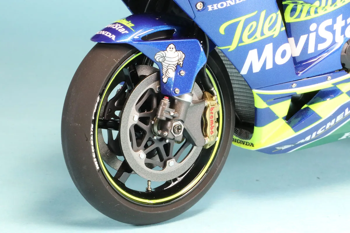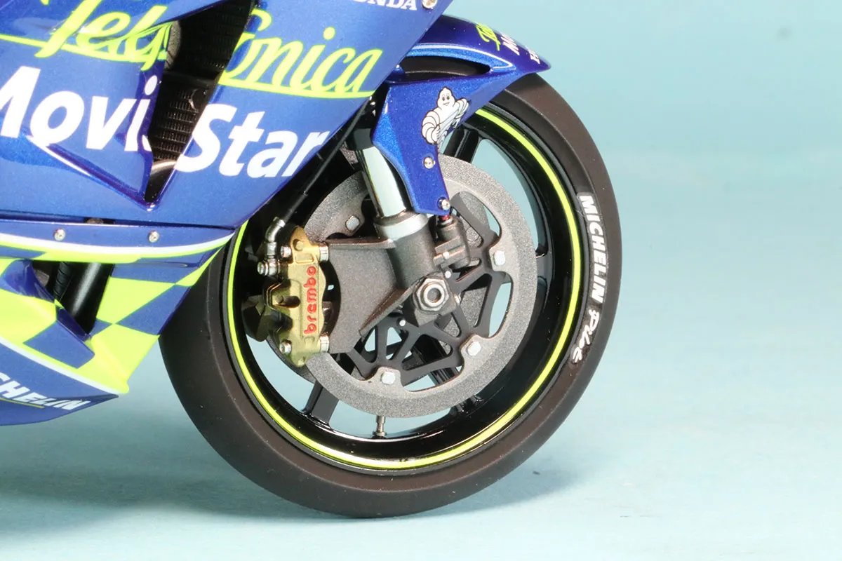 タミヤのプラモデルベース完成品です。テレフォニカ仕様のプラモデル自体発売されていますが本来の仕様と若干違うため、同じRC211Vのポンズのキットから一部パーツを流用してしあげています。また、ホビーデザイン、トップスタジオ、ファルコンスケールモデルのディティールアップパーツを組み込んで仕上げています。また製作をまとめた動画をモデラーがアップいたしておりますので最後に掲載いたしましたのでそちらもご視聴ください。