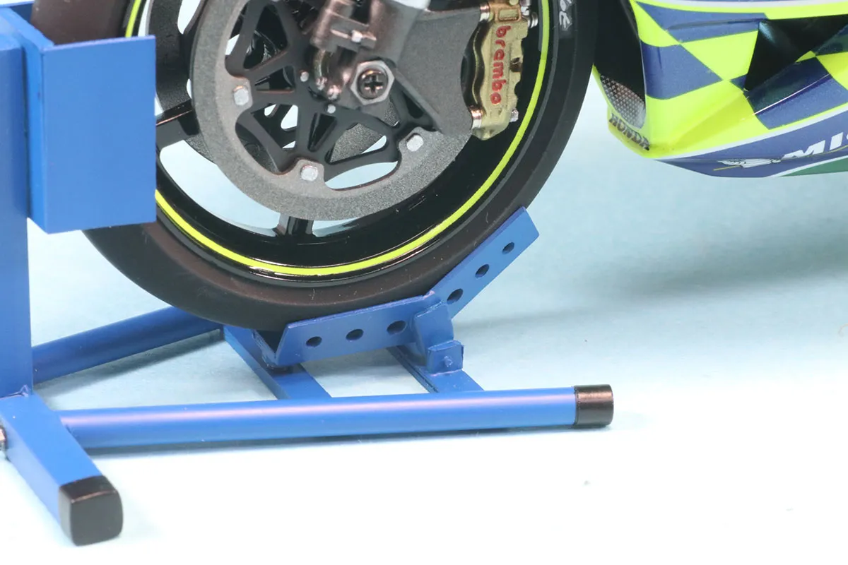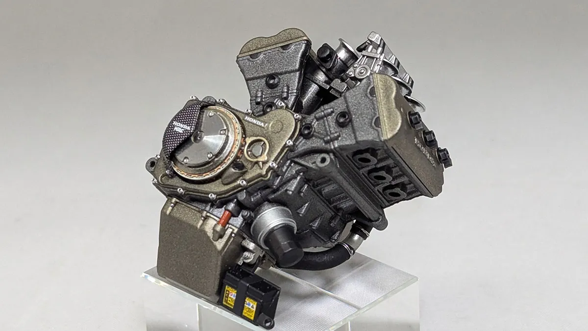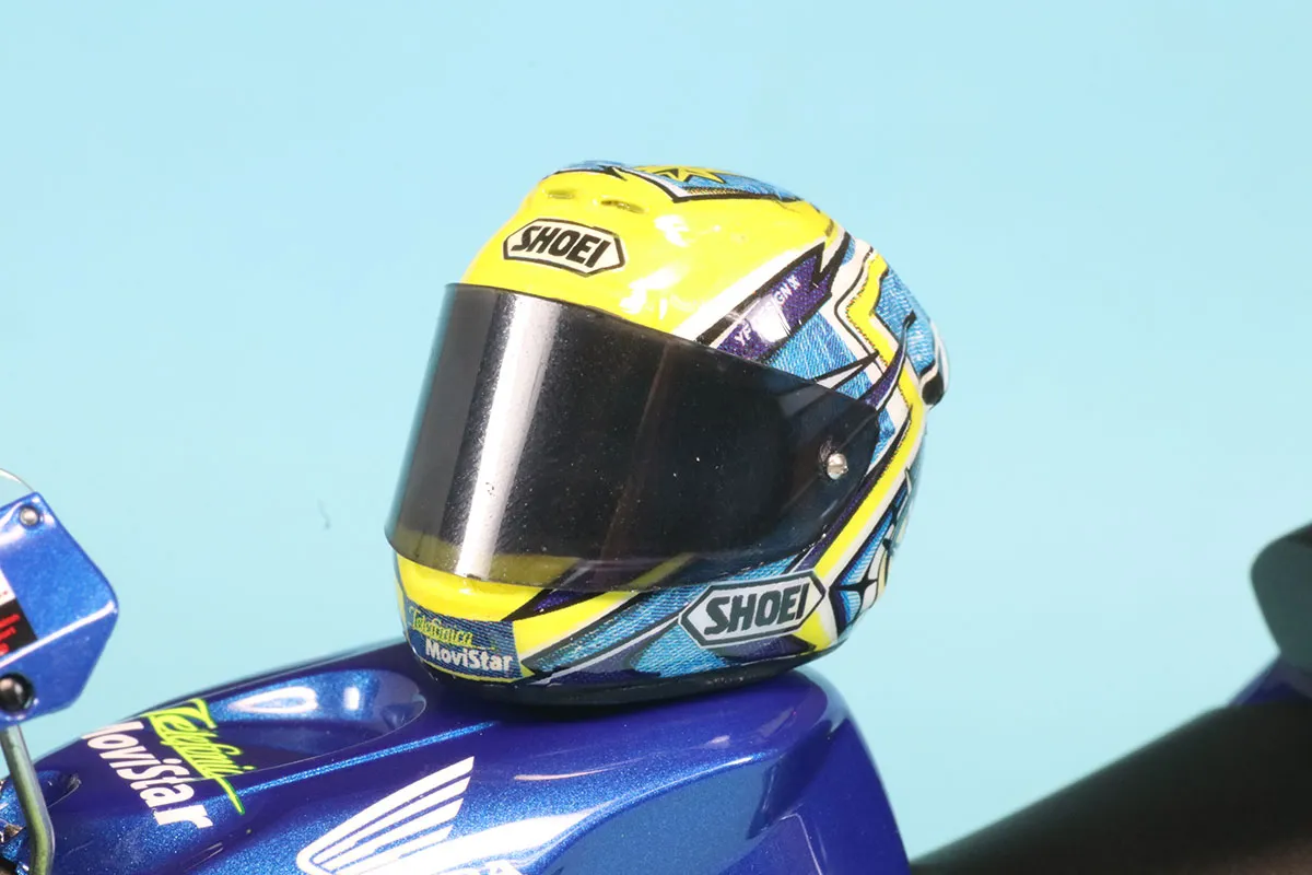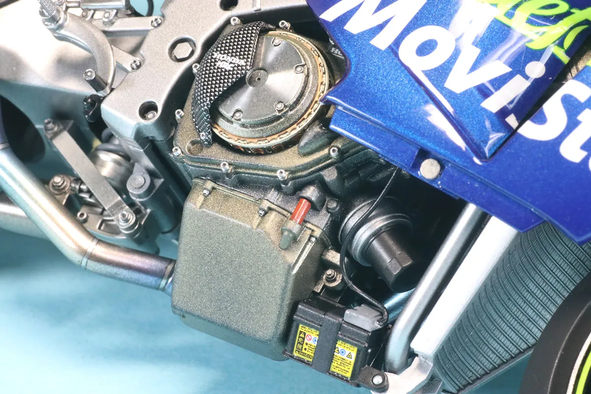 タミヤのプラモデルベース完成品です。テレフォニカ仕様のプラモデル自体発売されていますが本来の仕様と若干違うため、同じRC211Vのポンズのキットから一部パーツを流用してしあげています。また、ホビーデザイン、トップスタジオ、ファルコンスケールモデルのディティールアップパーツを組み込んで仕上げています。また製作をまとめた動画をモデラーがアップいたしておりますので最後に掲載いたしましたのでそちらもご視聴ください。