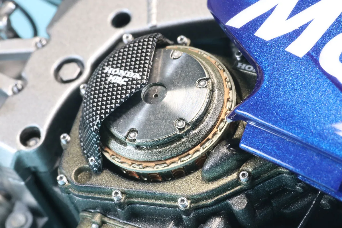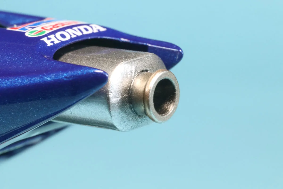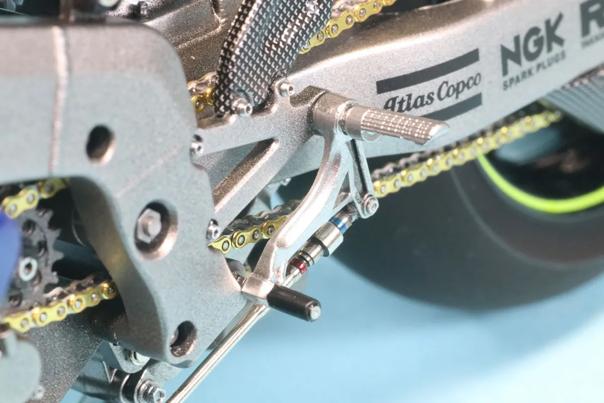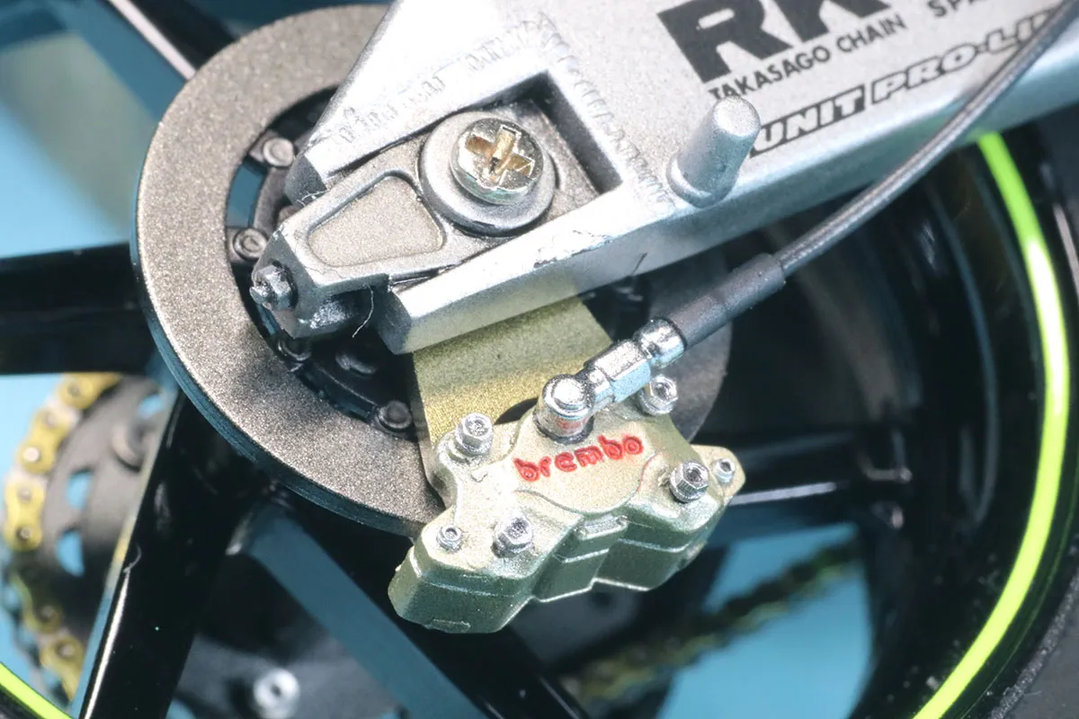 先日プラッツのRGVγを製作いただき販売させていただかいましたが、今回は専用のディティールアップパーツを組み込んでいるため脅威の仕上がりになっています。マクロレンズで撮影しても荒さがなく撮影に耐えられる仕上がりはまさに息を呑むような衝撃を受けます。ほんとに小さな箇所ではありますがそれが集合体となることであたかも本物のバイクが目の前にあるかにような錯覚を感じるのは製作者の感性が現れている証拠だと思います。