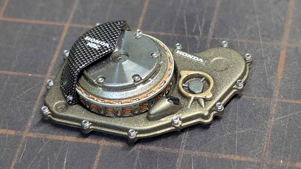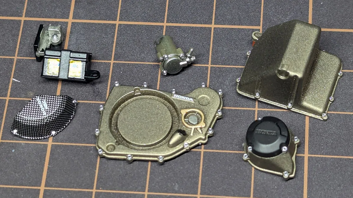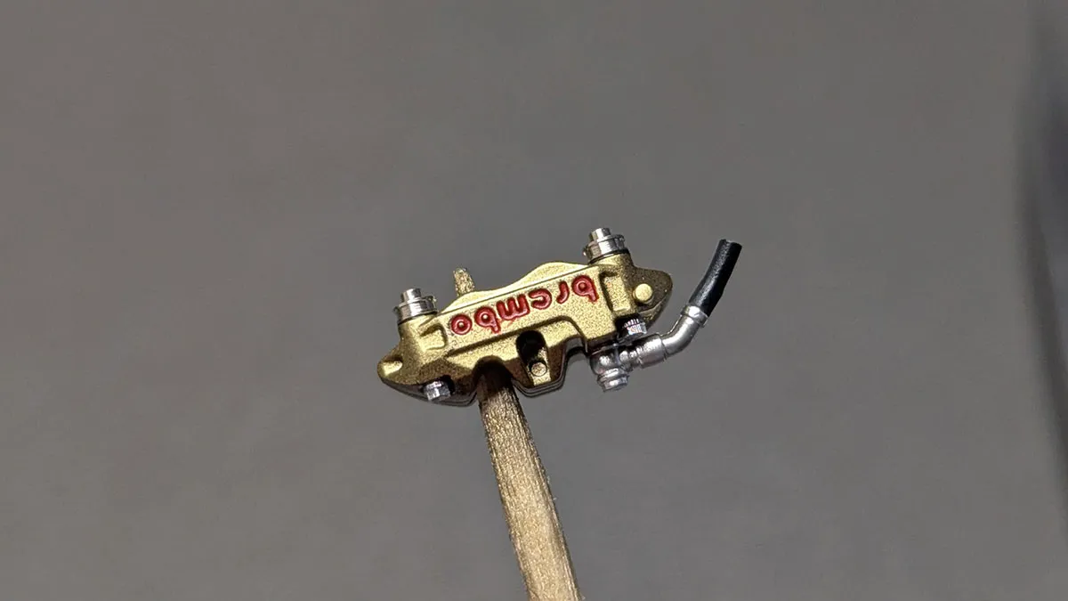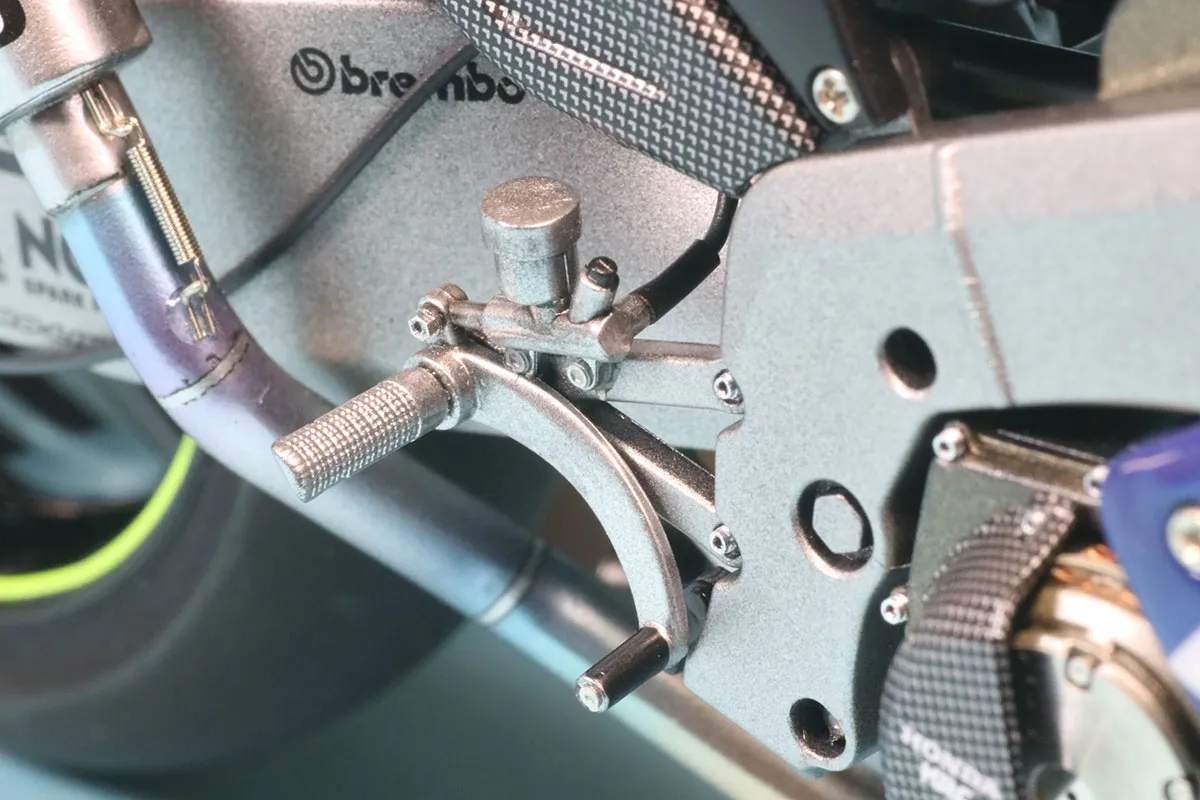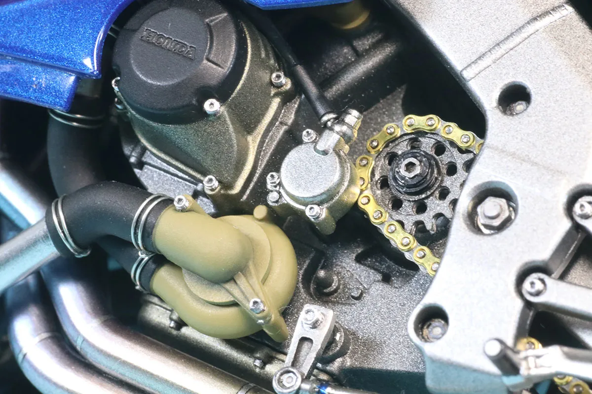 先日プラッツのRGVγを製作いただき販売させていただかいましたが、今回は専用のディティールアップパーツを組み込んでいるため脅威の仕上がりになっています。マクロレンズで撮影しても荒さがなく撮影に耐えられる仕上がりはまさに息を呑むような衝撃を受けます。ほんとに小さな箇所ではありますがそれが集合体となることであたかも本物のバイクが目の前にあるかにような錯覚を感じるのは製作者の感性が現れている証拠だと思います。