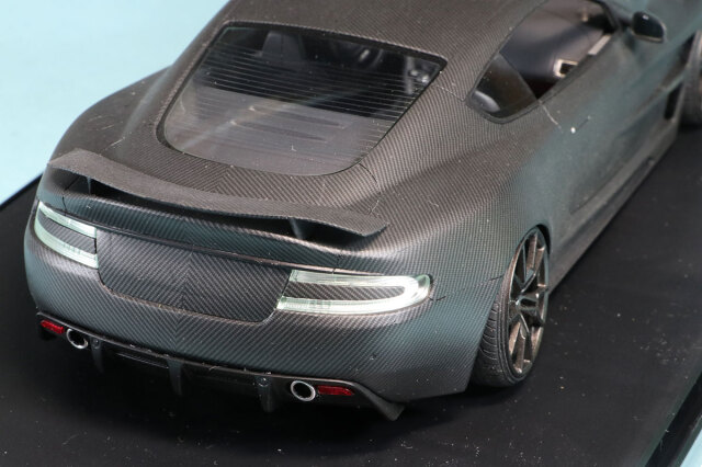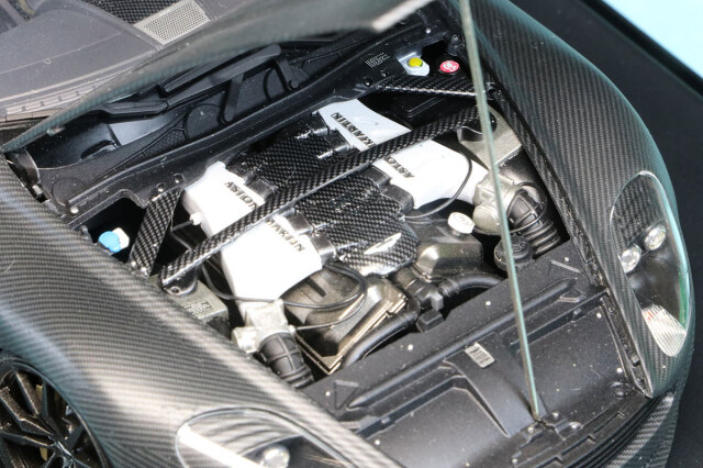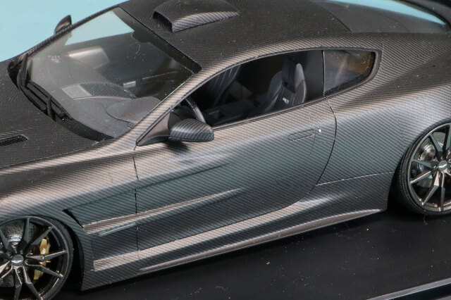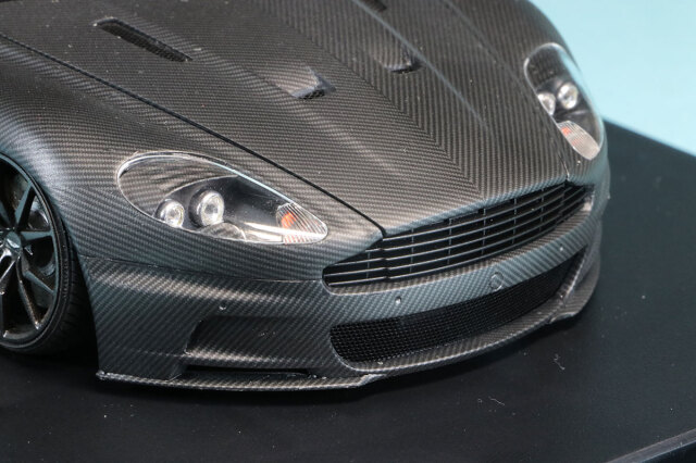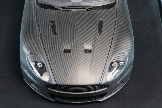 タミヤプラモデルベース完成品です。対応のカーボンデカールが発売されているわけではありませんので汎用カーボンデカールを切り出して貼り付けられてます。綺麗に左右対称になるよう処理されていてパターンの向きも綺麗に揃えられていてます。バンパー部分は特に分割が難しい部分ですがあたかも実車がそうなっているかのような仕上がりになっています。