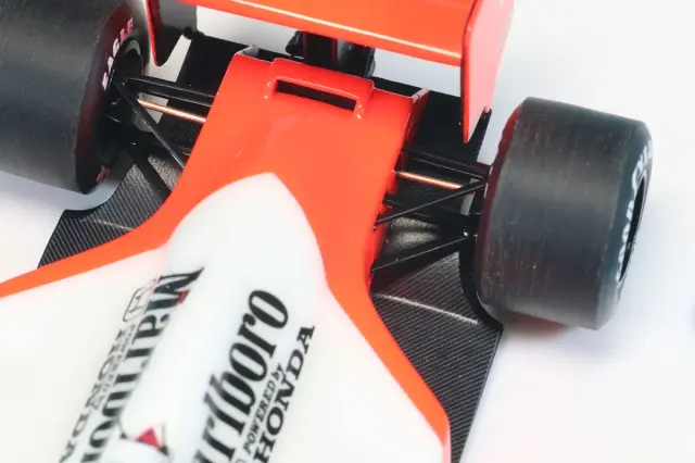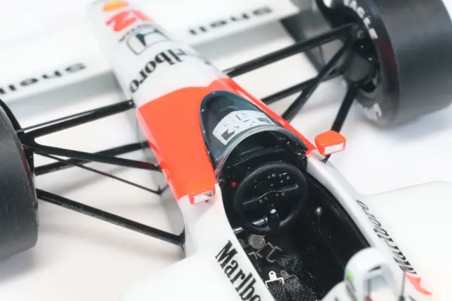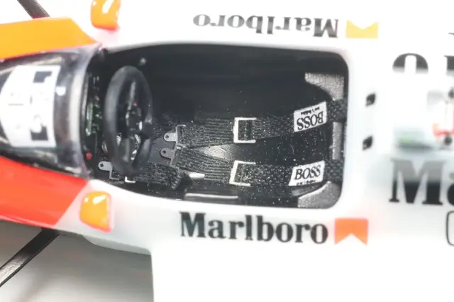 このモデルは、単なる模型ではありません。セナとプロストが16戦中15勝を挙げた、最強マシン、マクラーレンMP4/4の圧倒的な存在感を、手元で蘇らせるための「鍵」なのです。ロムファクトリーの完成品は、その緻密さにおいて、他の量産品とは比較になりません。細部に至るまで徹底的に作り込まれ、実車が持つオーラさえも感じさせてくれます。特にこのモデルは、布製シートベルトへの交換、エアバルブの追加、そしてミラー鏡面への徹底的なこだわりなど、製作者の情熱が細部に宿っています。同じロムファクトリーの完成品と並べて展示すれば、あなたのコレクションは、まさに「動く博物館」と呼ぶにふさわしい、圧巻の光景となるでしょう。伝説のマシンを、ぜひあなたのコレクションに加えてください。