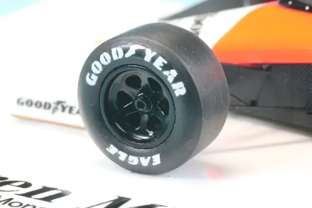 タメオメタルキットベース完成品です。これまでタメオからターボダクトの付いていないキットしか販売されていませんでしたが、ついにターボダクト付きの前期型が登場しました。キットはモナコGPとサンマリノGPのコンパチとなっており、どちらを製作するか迷いましたがモナコ仕様にしました。今回はキットのストレート組みですが特にいじることなく見栄えのいい仕上がりになっています。そこはさすがタメオというしかありません。 製作したモデラーさん曰く組み上げについては最新キットの割に手のかかる内容になっていて、一部設計ミスがあったりとなかなか手強いキットだったとのこと。モデラーさんとしては珍しく一から組み直しの調整もしたとのことでした。そのような痕跡など微塵も感じさせない仕上がりですが、実際にキットを渡してから納品までの期間がいつも以上にかかっていましたからかなり手こずったのは間違いないと思います。