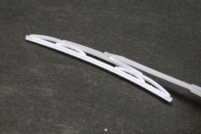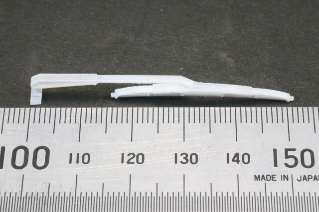完成モデルのワイパーの紛失や破損などで交換する用にSMCさんへ依頼して作ってもらいました。全長50mm、アーム長30mm、ブレード長35mm、ロードカータイプをモチーフにしています。下処理なくラッカーやエナメル塗料を筆塗するだけで十分に再現できます。