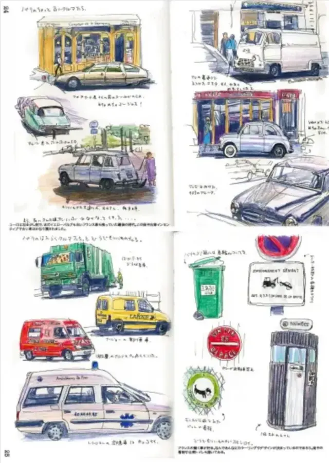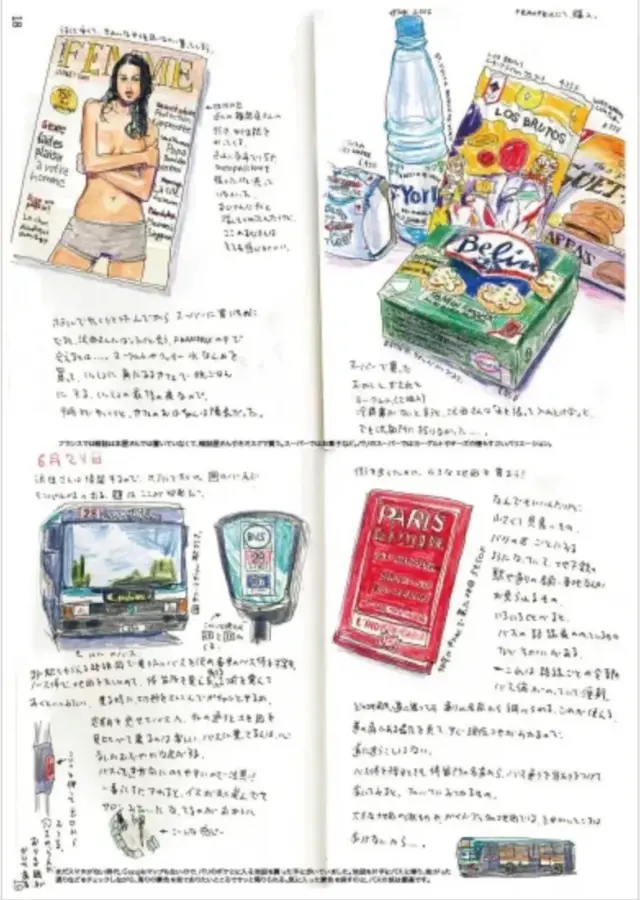 パリの犬から働くクルマまで。絵日記の見開きを1ページで原寸大で編集しています。